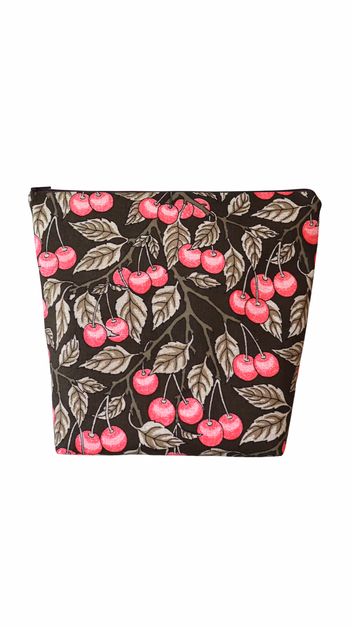Yttertyg av stadig bomull med brun botten och mönster av körsbär och blad i olika färger.