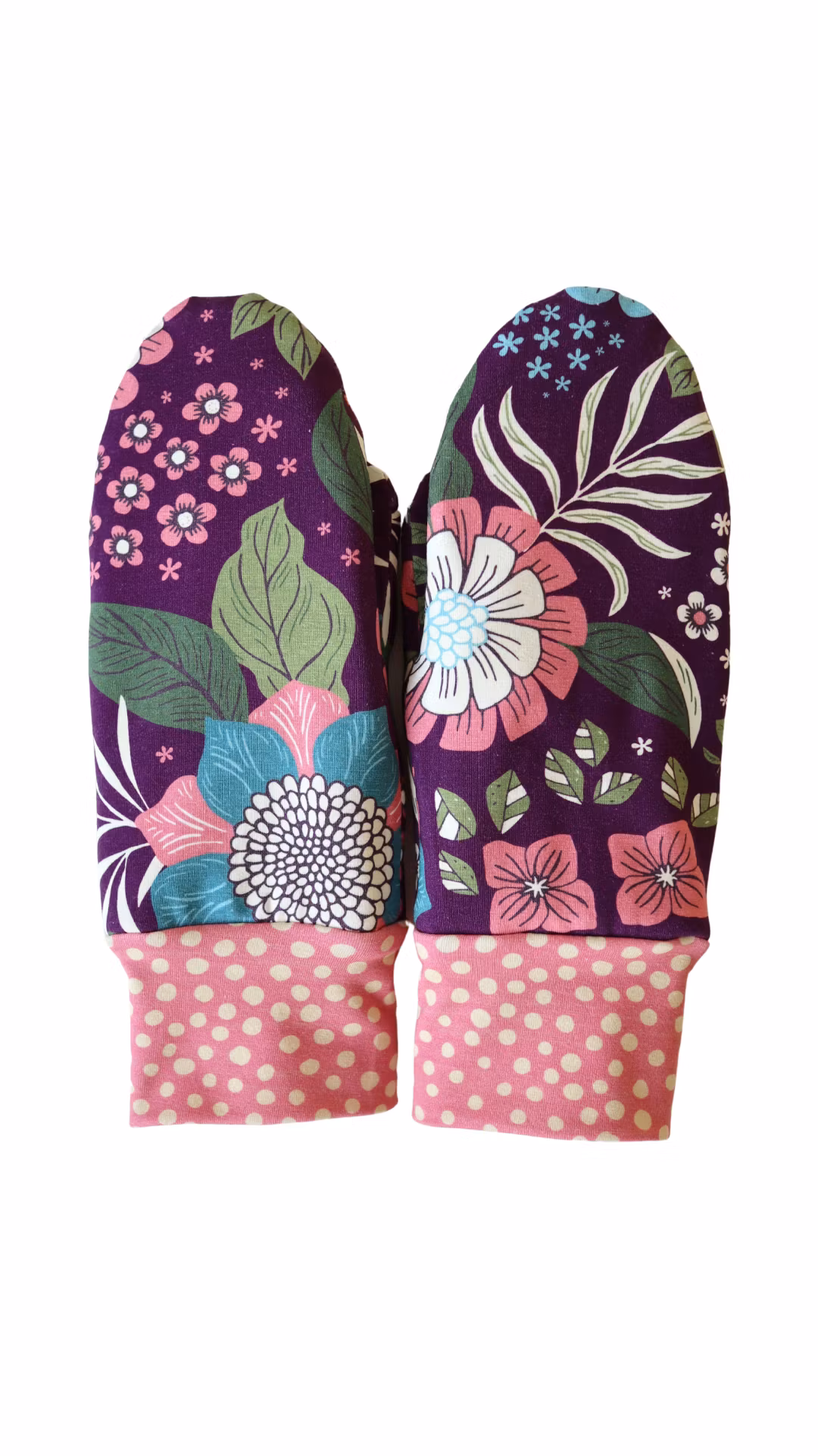 Färgsprakande tumvantar sydda av ekologisk bomullsjersey och fodrade med mjuk och värmande ekologisk bomullsfleece.