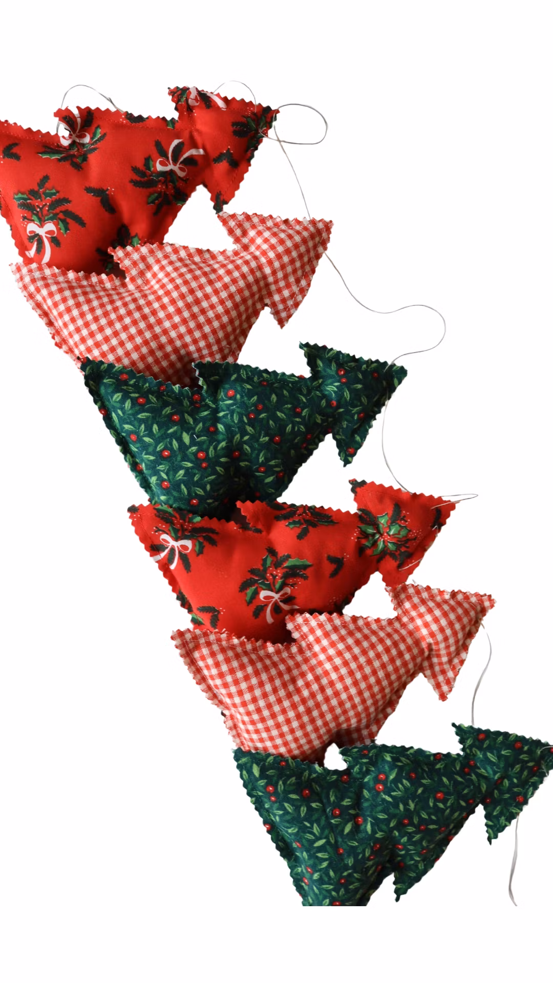 Girlang med stoppade granar sydd av återbrukade tyger.