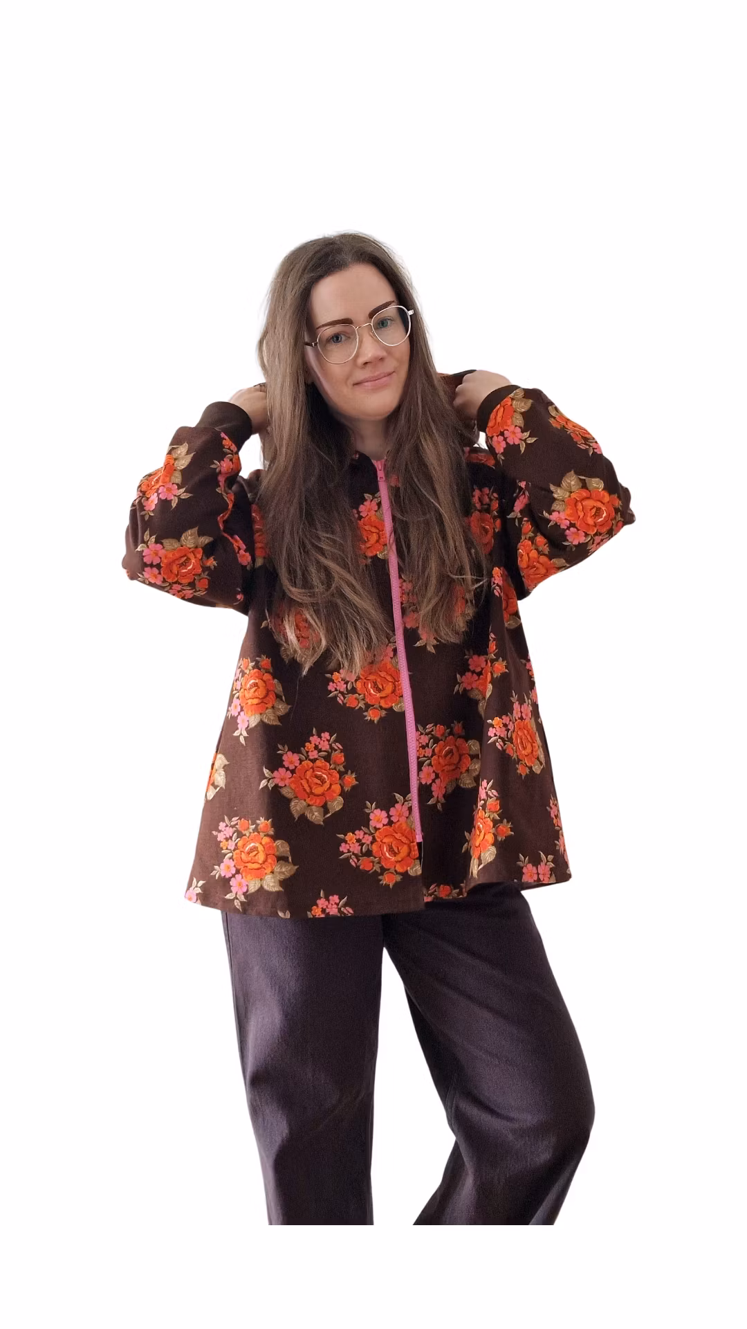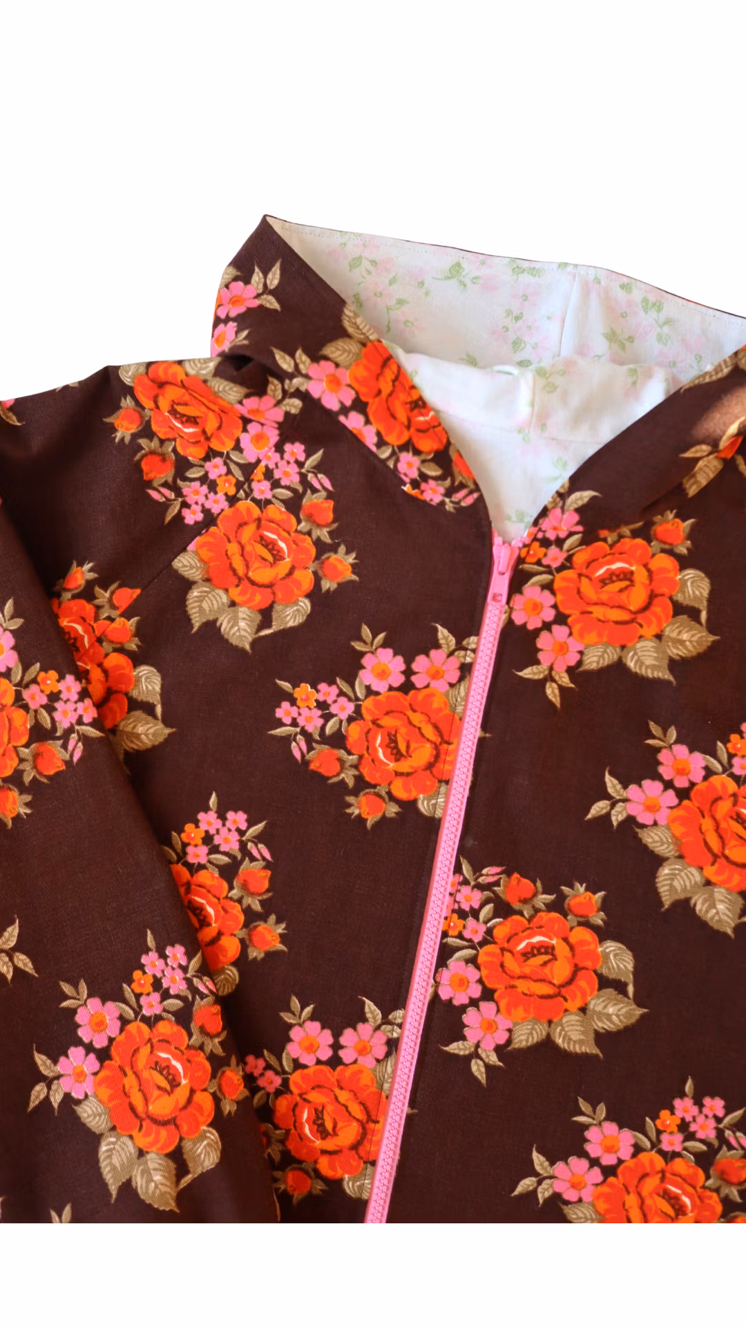 Jackan är blommig på brun botten och har: